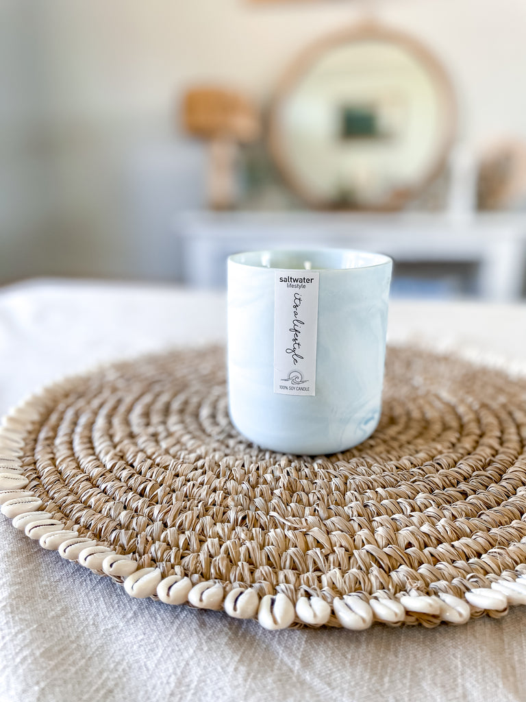 A beautiful ceramic white wash jar with a timber lid, 80+hour burn time. Filled with one of our 14 surf inspired eco friendly fragrances using the finest, sustainable soy wax. This candle is also gift boxed in a coastal white box.